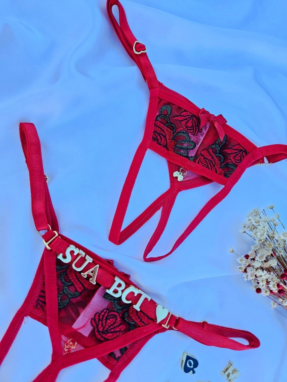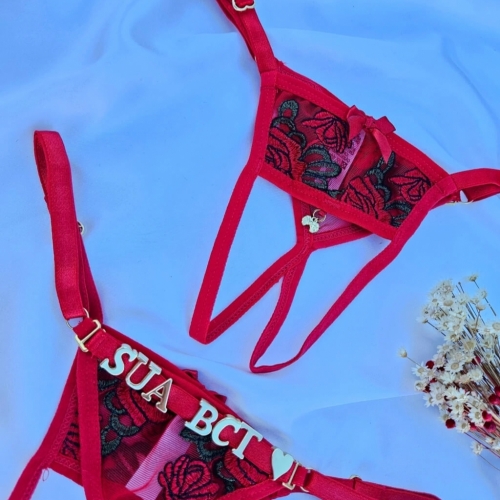 1- calcinha secretária bordado com rosas personalizável; detalhe em pingente na parte da frete, abertura na parte baixa.