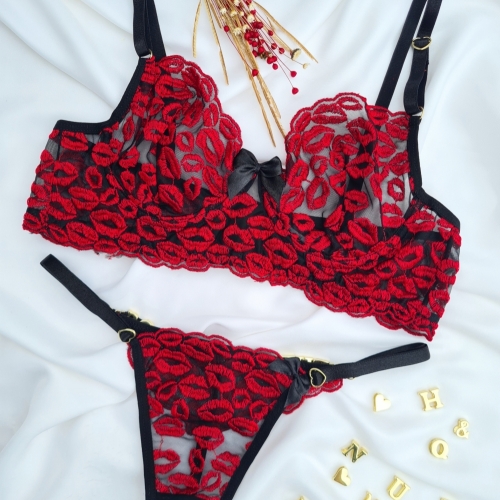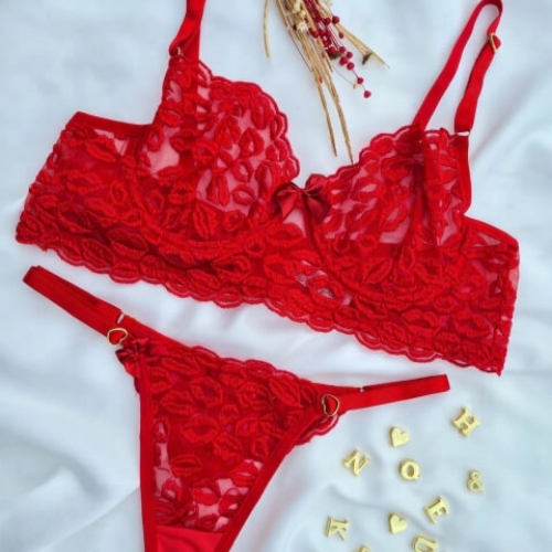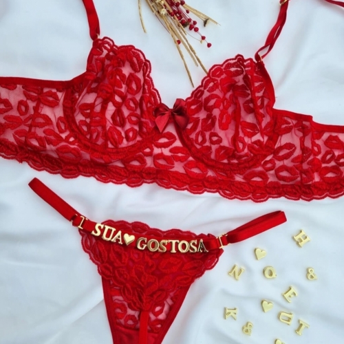 O Conjunto beijo personalizável + 4 letras e 1 emoji. Lingerie elegante, sexy e perfeita. Sutiã sem bojo, rico em detalhes com tule bordado em estampa de beijos, laço e pingente. A calcinha personalizável possui forro 100% algodão, toda em tule bordado de beijo com forro. Personalize sua calcinha com as letras e símbolos que desejar, no seu pedido.