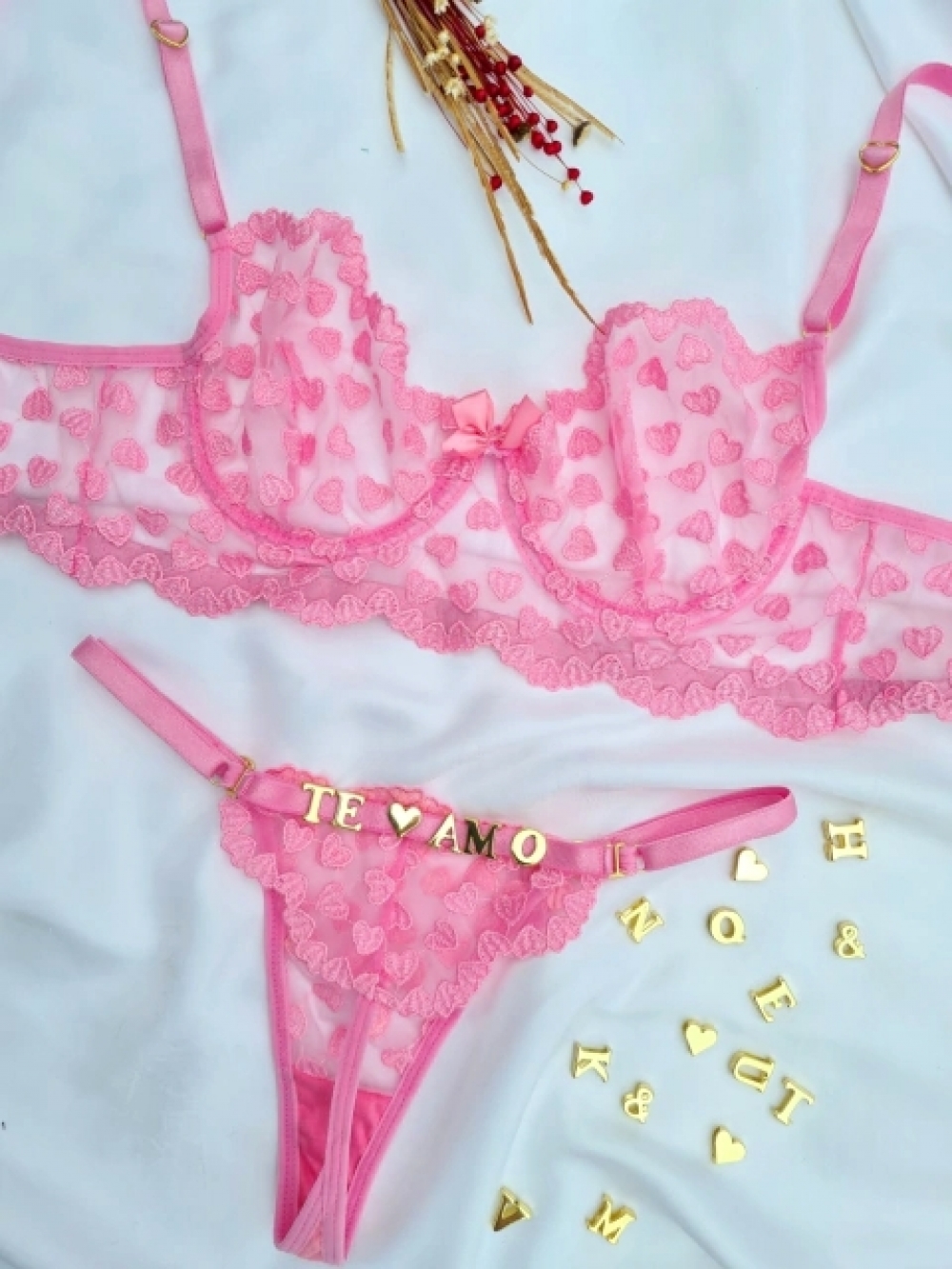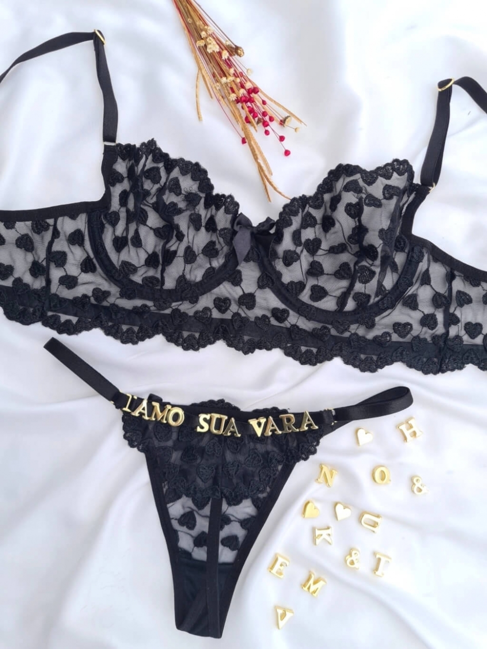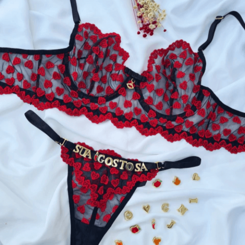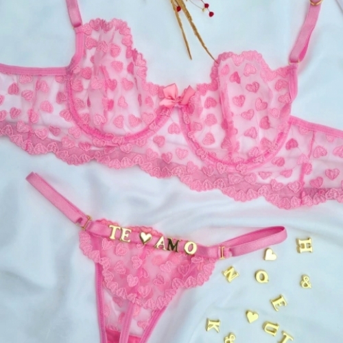 O Conjunto Lulu tule coração personalizável + 4 letras e 1 emoji. Lingerie elegante, sexy e perfeita. Sutiã sem bojo, rico em detalhes com tule bordado em estampa de corações, laço e pingente. A calcinha personalizável possui forro 100% algodão, toda em tule bordado de coração com forro. Personalize sua calcinha com as letras e símbolos que desejar, no seu pedido.